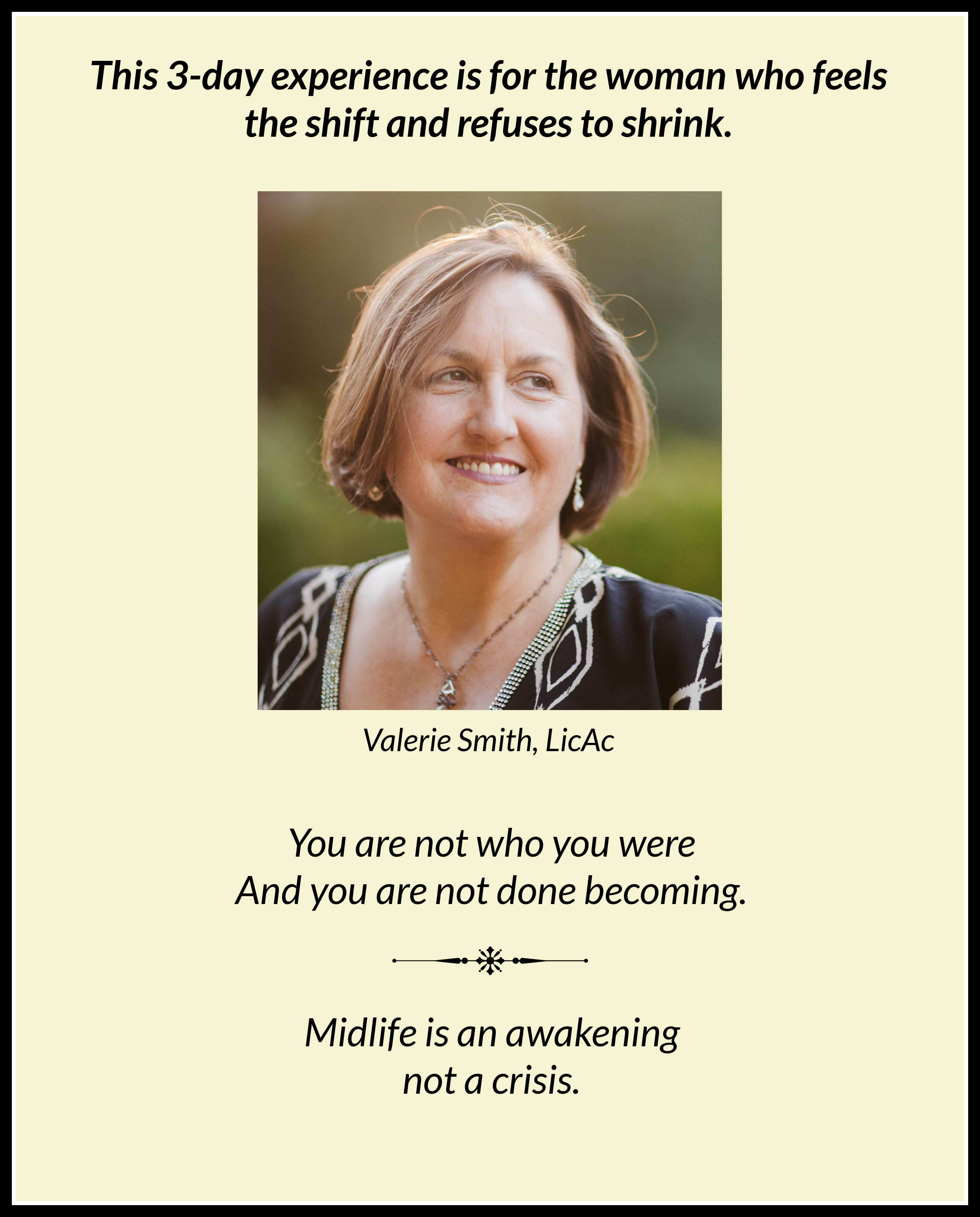 I am a women’s wellness mentor and acupuncturist with 29 years of experience rooted in Chinese medicine. Today, my work focuses on women entering their "crone era"—those ready to trade the hustle for a second half of life defined by clarity, meaning, and embodiment. My "signature process" is that there isn't one. I don't believe in rigid frameworks; instead, I use my decades of observing patterns in body and energy to meet every woman exactly where she is. Together, we move through the transition from who I was to who I am now using four foundations: Clarity, Curiosity, Mindset, and Self-Compassion.
